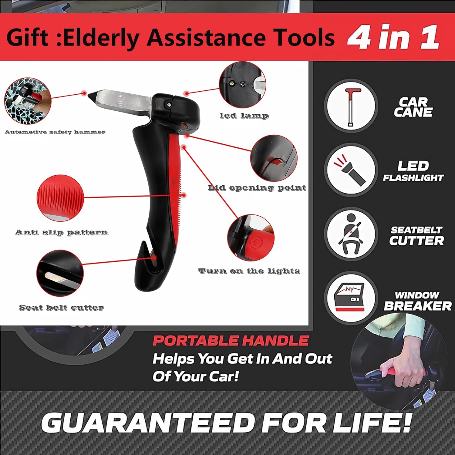 - Auxiliary gifts:Five in one Retractable Leg car Support Handle, Elderly Portable car Door Assist Handle, Multifunctional car Handle with LED Light, Safety Hammer, Safety Belt Cutter